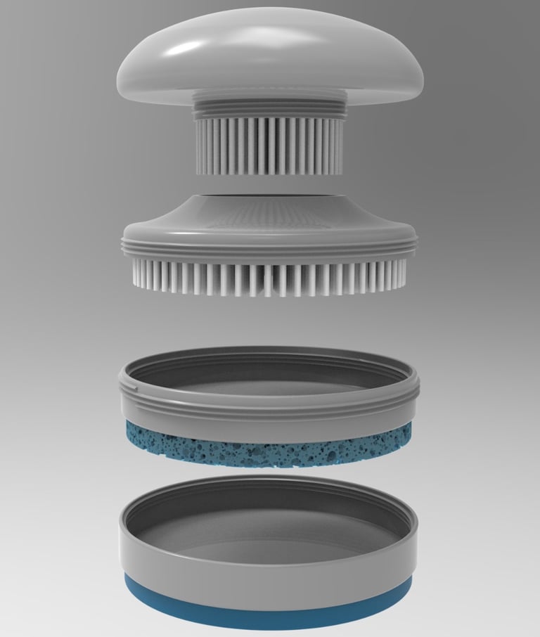 Artículo enfocado al área de cocina, específicamente a la limpieza de estufa y lavavajillas. Está basado en el sistema de la muñeca rusa Matrioshka, con un pequeño cepillo fijo y tres compartimentos removibles e intercambiables, entre los que se encuentra un cepillo, esponja y fibra. Cada accesorio resuelve una función como fregar, limpiar y absorber. La base en la que se guarda el artículo tiene una función decorativa para una mejor practicidad y accesibilidad al momento de guardarlo y utilizarlo.