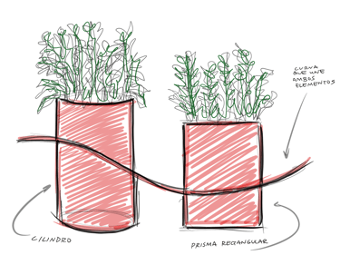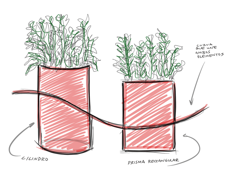 La maceta busca retratar la idea de combinar formas orgánicas, usualmente encontradas en la naturaleza, con elementos geométricos básicos. La configuración del diseño propone una unión entre dos elementos individuales para actuar como uno solo al introducir el uso de una curva, pero manteniendo el uso independiente para cada uno.