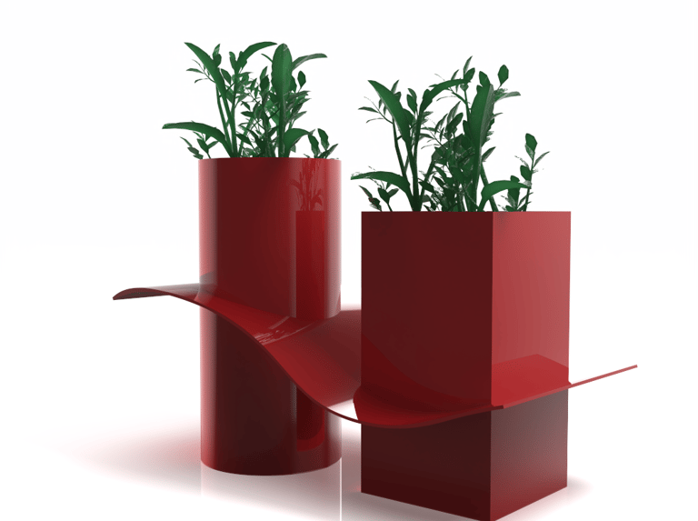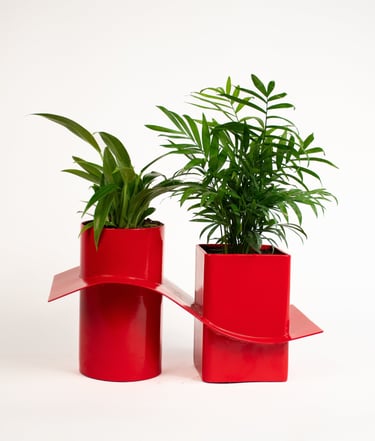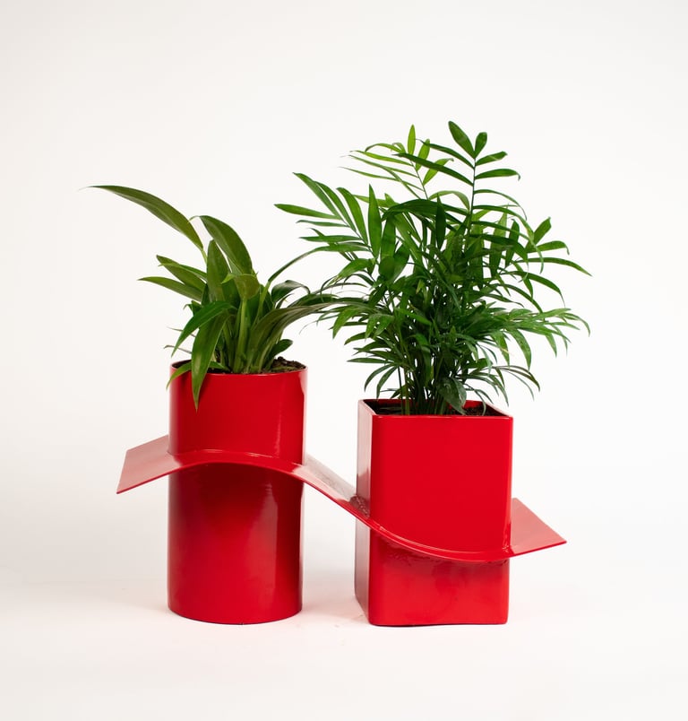 El objeto, elaborado a partir de láminas de acero y perfiles tubulares, resalta la sensación de delicadeza de su fabricación, mientras que la selección del acabado en color rojo crea un contraste equilibrado con las plantas.