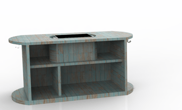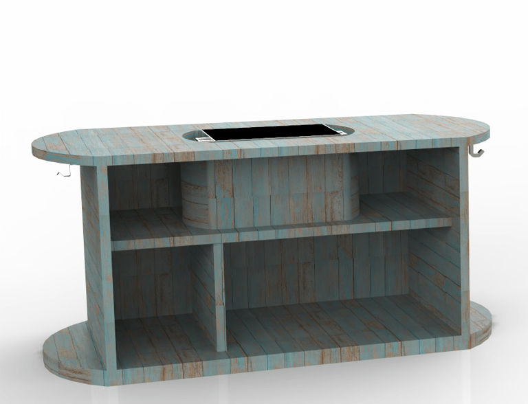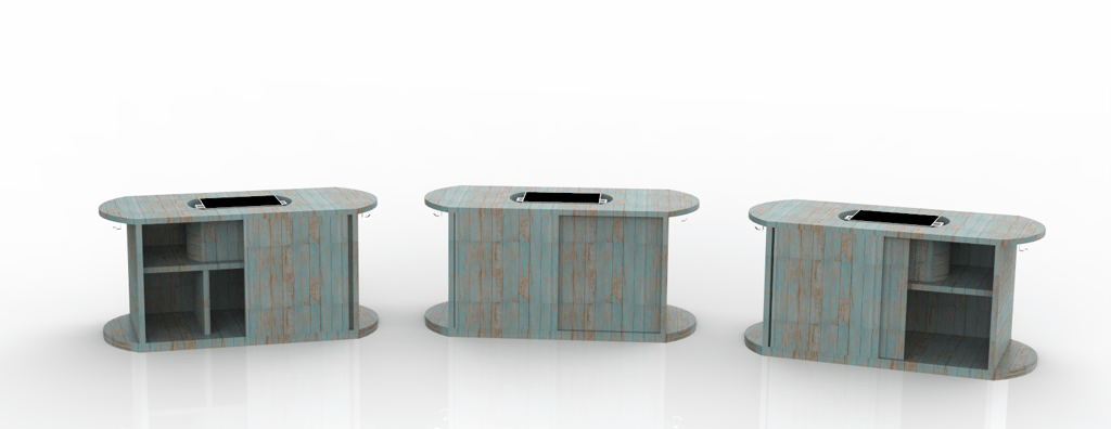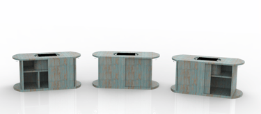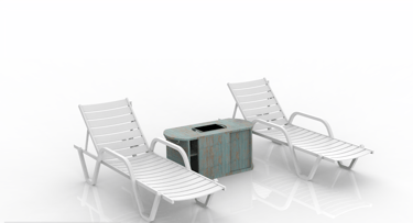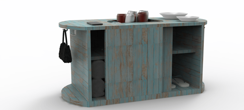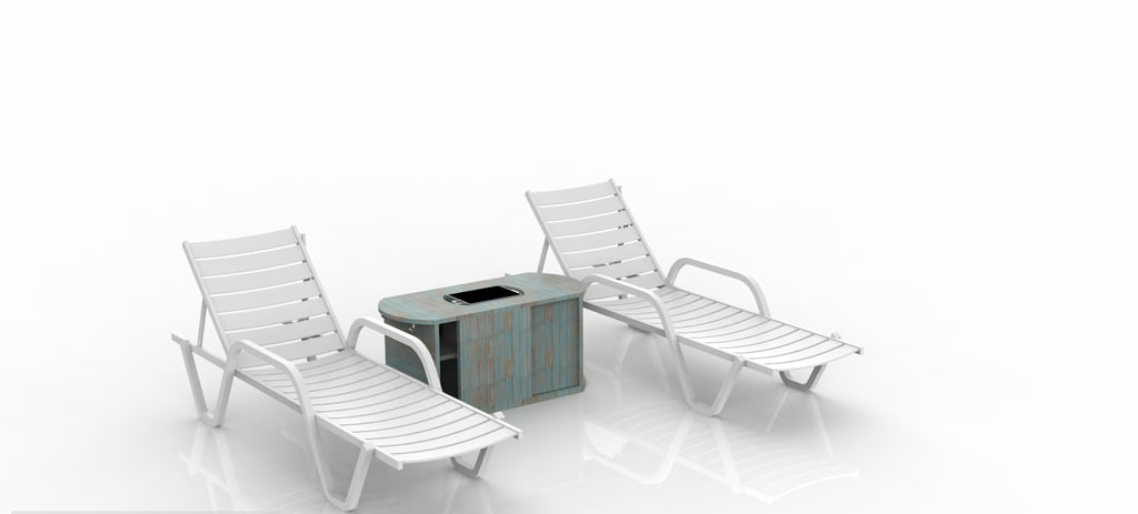 Diseño de un mueble pensado para complementar espacios exteriores en un club de playa, específicamente ubicado en el área cercana a camastros.