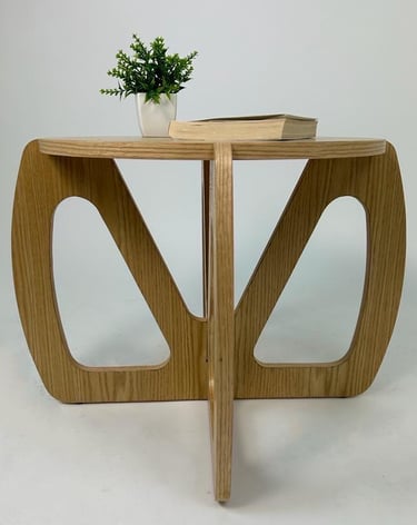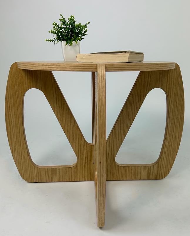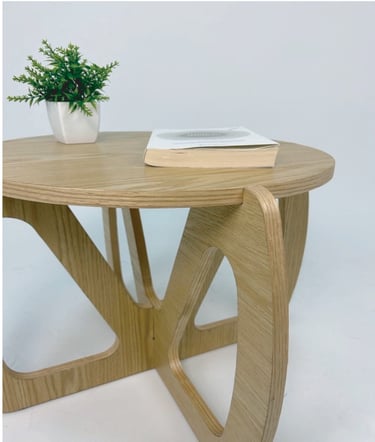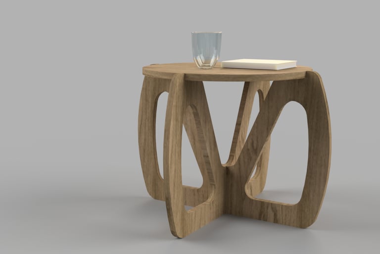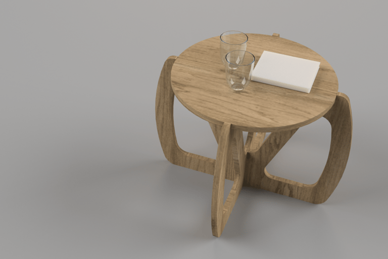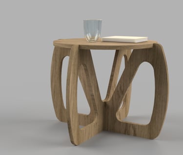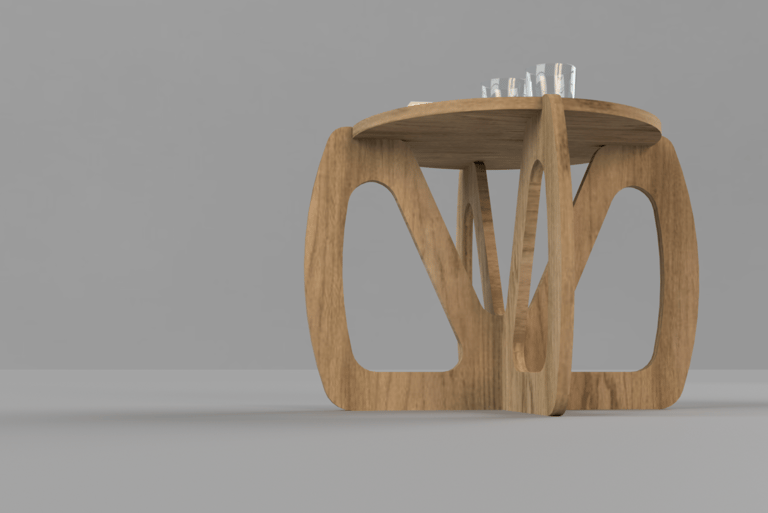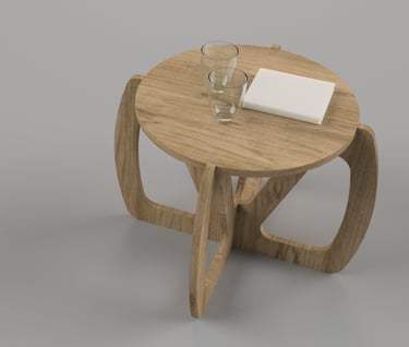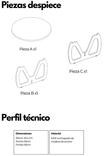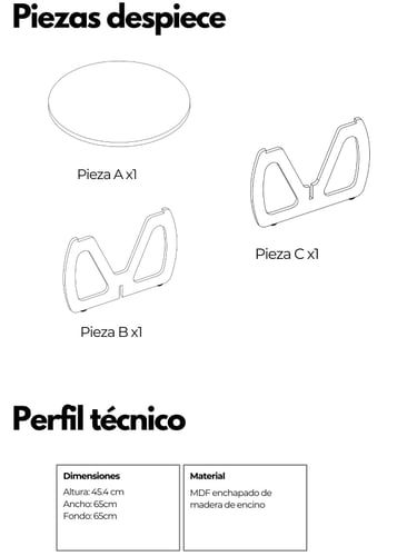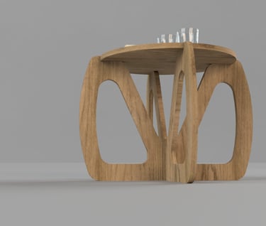 Mesa fabricada en MDF con enchapado de roble y acabado mate con ensamblaje de media madera. Para el diseño de las piezas que componen la mesa, se utilizó modelado 3D y se realizó un despiece en AutoCad para luego ser cortado en una fresadora CNC. Posteriormente, las piezas se lijaron, se colocó el canto, se barnizó y, finalmente, se realizó el embalaje.